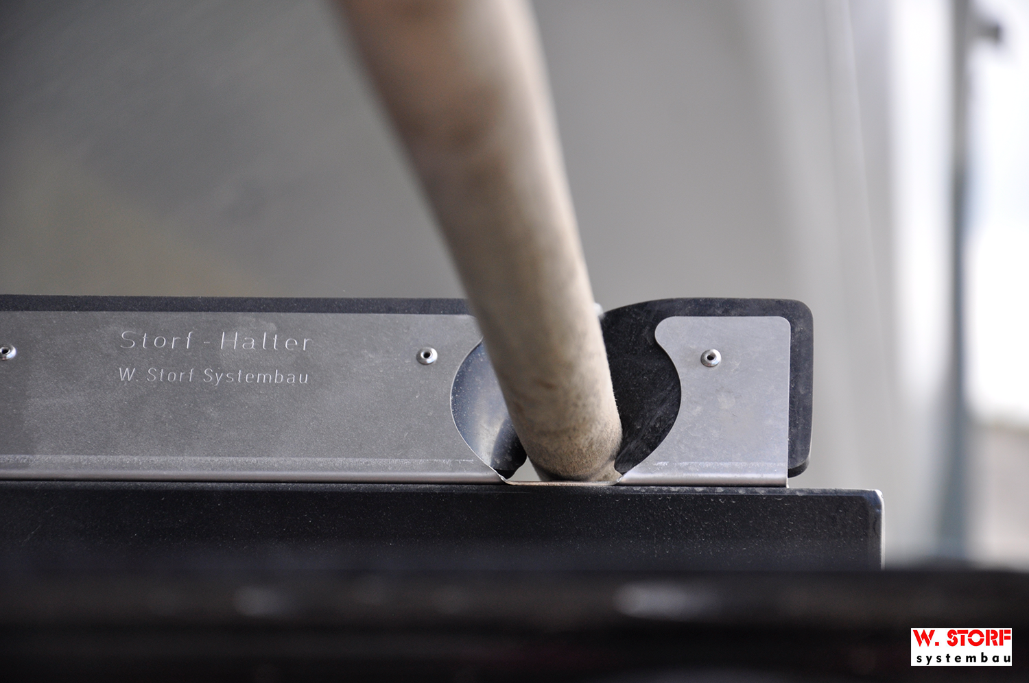 Die Schaufel oder Besen werden in den Halter eingedrückt und vom Gummi wie in einer Passung gehalten. Durch die Absorbierungsfähigkeit des Gummis gibt es keine Klappergeräusche der Gerätschaften, was sonst gerne bei Standgasbetrieb geschieht.
